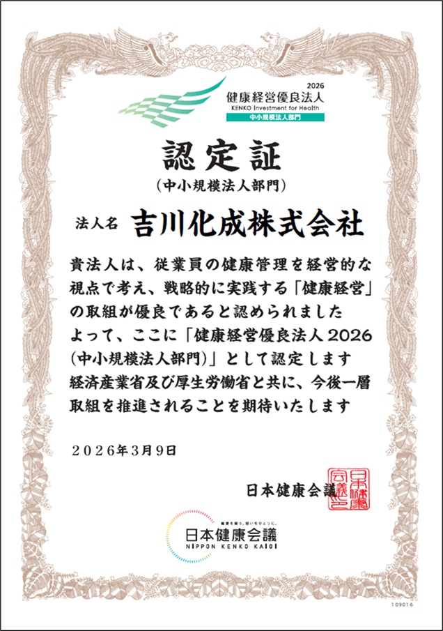 今年度も 「健康経営優良法人 2026(中小規模法人部門)」に認定されました。従業員の健康を重要な経営課題と捉え、安心して働ける環境づくりに取り組んでいます。